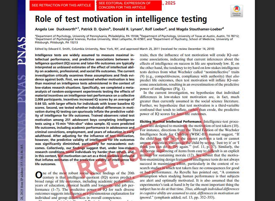 The authors of a paper on how motivation influences intelligence test scores have retracted their paper following the retraction of