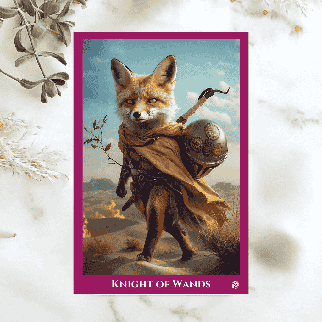 In traditional tarot imagery, the Knight of Wands rides a rearing horse across a desert landscape, wand raised, cloak billowing in the wind. His eyes are forward—never backward. He’s part messenger, part warrior, and part creative firestarter. The suit of Wands is tied to the element of fire, and this Knight embodies that energy in motion.
